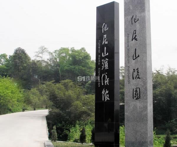 重庆仙居山公墓沿用中国传统皇陵的中轴线布局设计,采用地喻人形、拥抱山川、天人合一方案,有神圣崇高,气度恢弘,庄严古朴而生机盎然的中式皇陵特色。陵园前有广场、绿荫、放生池、停车场,坐东朝西,地貌呈“座椅”形状,青山环抱,三山真可谓“前面有照,后面有靠,左右有抱。”